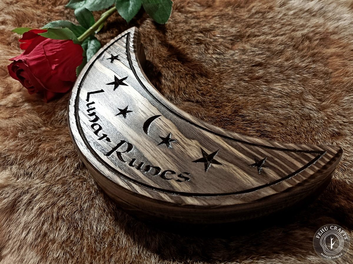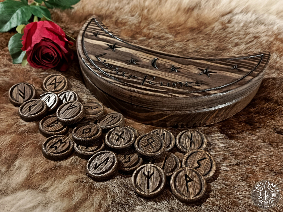 Precisely engraved Elder Futhark Runes in a beautiful wooden box designed as a crescent moon. A magical piece of jewelry for your altar, and every moon priestess’s dream to work with these powerful Lunar runes.