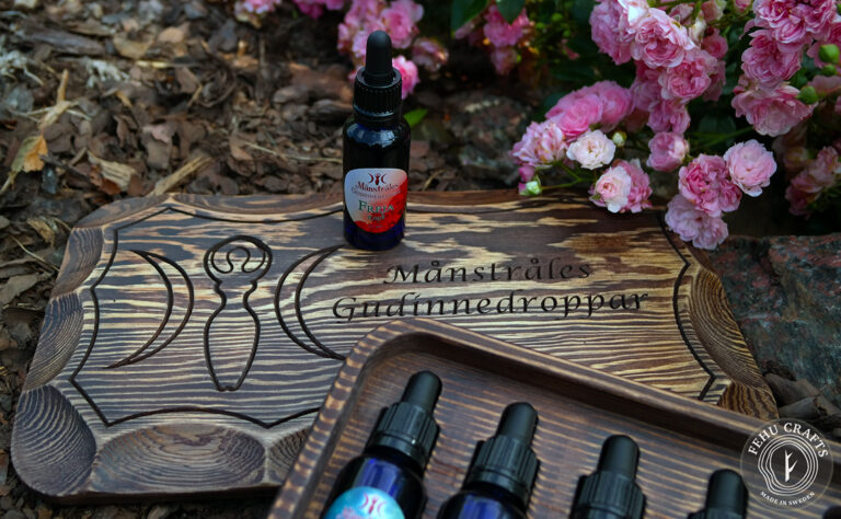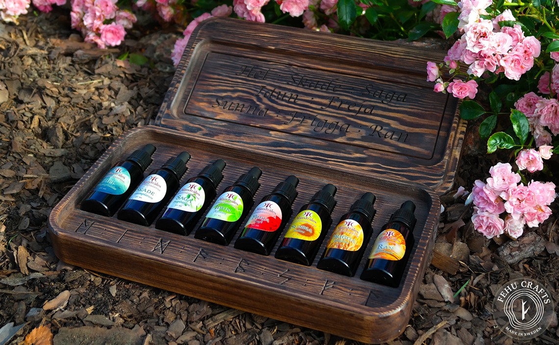 Work with the Norse Goddess’s eight different faces, like a journey through the Wheel of the Year, all packed in a uniquely designed wooden box for your altar. Månstråles Gudinnedroppar includes eight unique herb mixtures filled with vibrating Norse Goddess Power from Sweden.