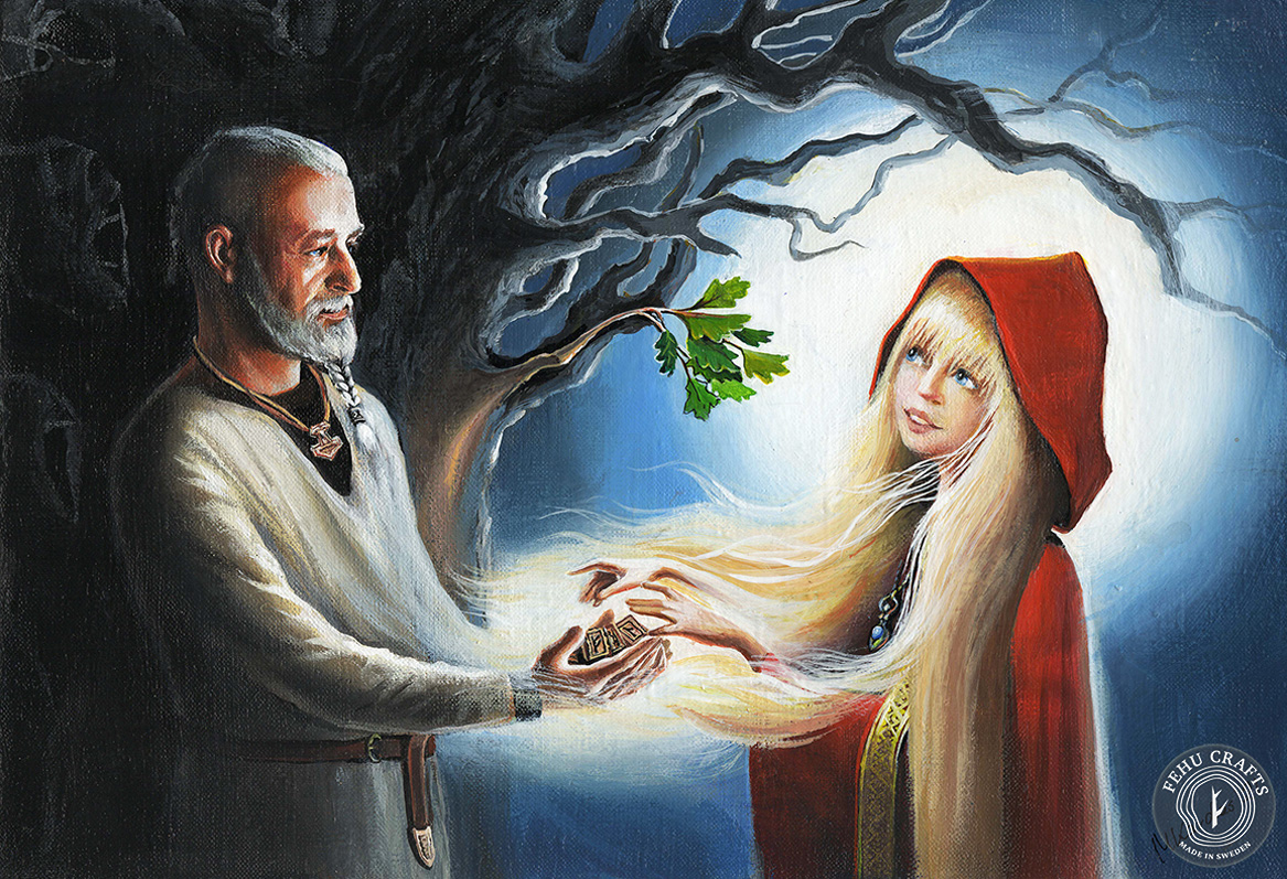 The painting, at the top of the page, shows the Priestess and the Runemaker during their magical meeting in the Blessing of the Runes. Painted personally for us by the artist Małgorzata Kardas, 2021 in Poland.