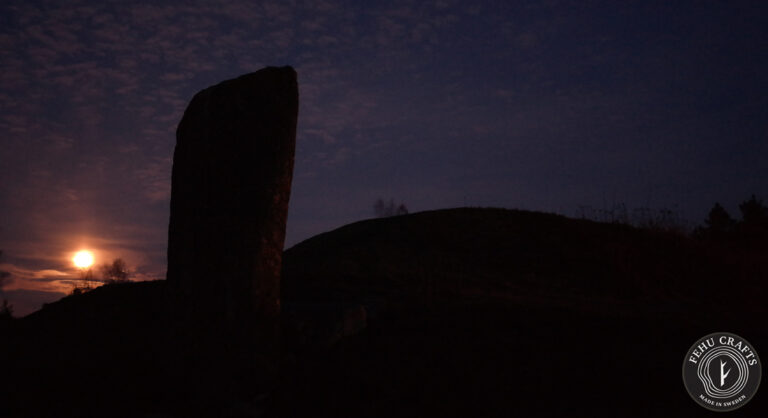 I want to share with you the vibrating energy of this place that I live in, where our Viking ancestors once lived and their presence is still strong at this burial site. It is with great respect that I will bless your runes before ancestors, Gods and Goddesses. The whispering voices that can be heard in the wind over Kungshållet’s burial mounds where the 3.3 meter high runestone has been erected for Spjut (Spear) where he is honored by Sigrid and Alrik. My gaze follows the two ravens that live here and sends out an exciting mystery where the interpretation automatically goes to Odin. I want to transfer the spirit from this powerful place through my blessing of your runes.