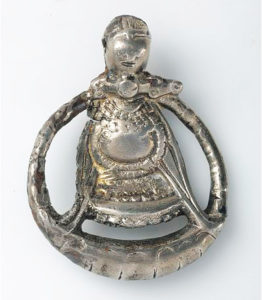 Interpretations of this find tell us about the Norse Goddess Freya with her precious necklace Brísingamen, which was the most beautiful piece of jewelry in the world, and many wanted to possess it. She holds her arms around her pregnant belly, which would symbolize that she is a fertility goddess and protector of all life. As a circle around Freya, we see her powerful necklace Brísingamen, which brings the interpretations to strong protection. Further interpretations tell us that Freya wears a characteristic suit, consisting of a wide coat and a long skirt underneath, which, just like the suit sleeves, is adorned with pearl edges. At the “back button buckle” near the neck, she is adorned with several pearl jewelry. On her head, Freya wears a tiara-like headdress. Her posture is majestic and there is calm resting over her where she sits and is one with life growing inside her belly.